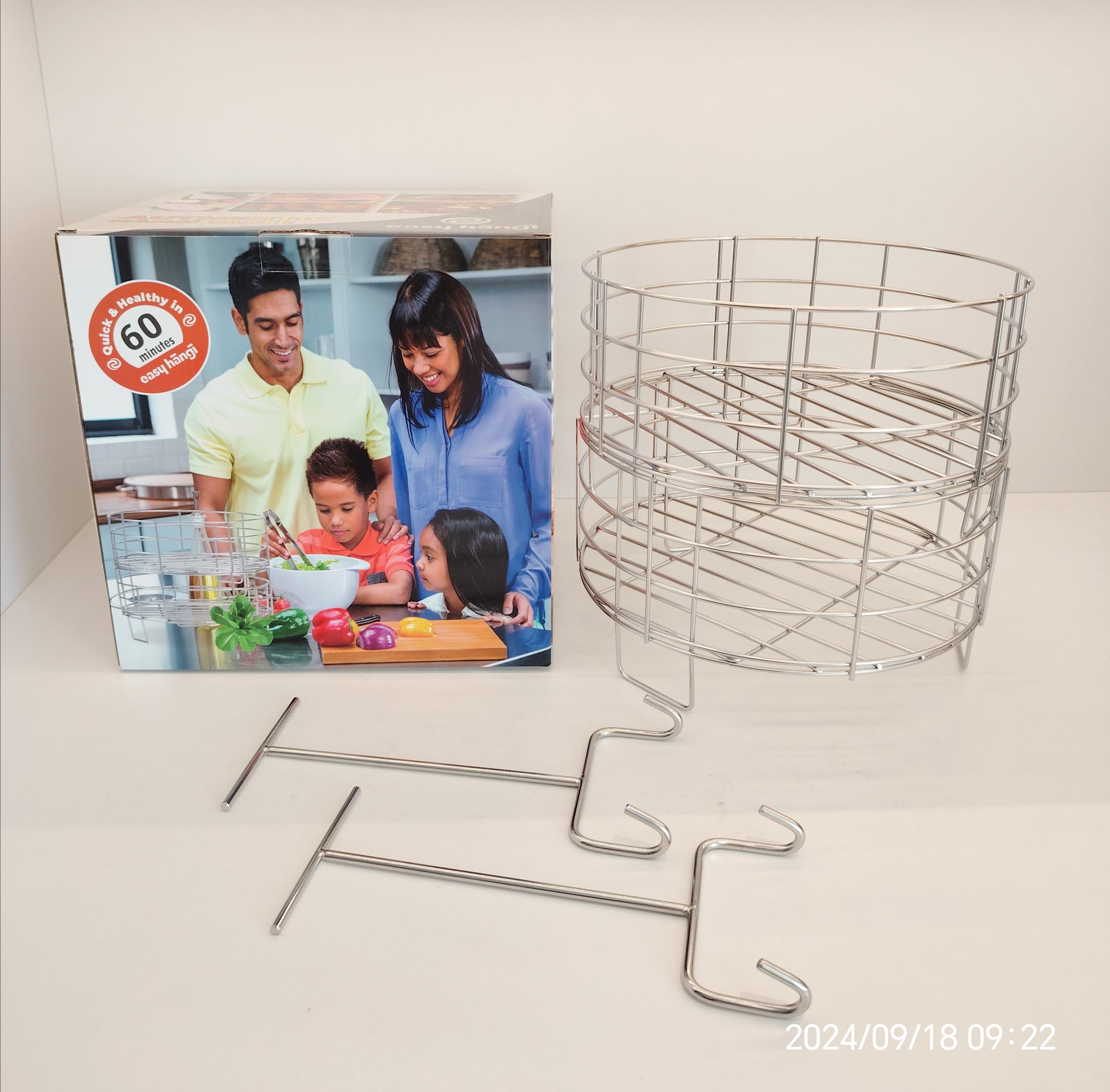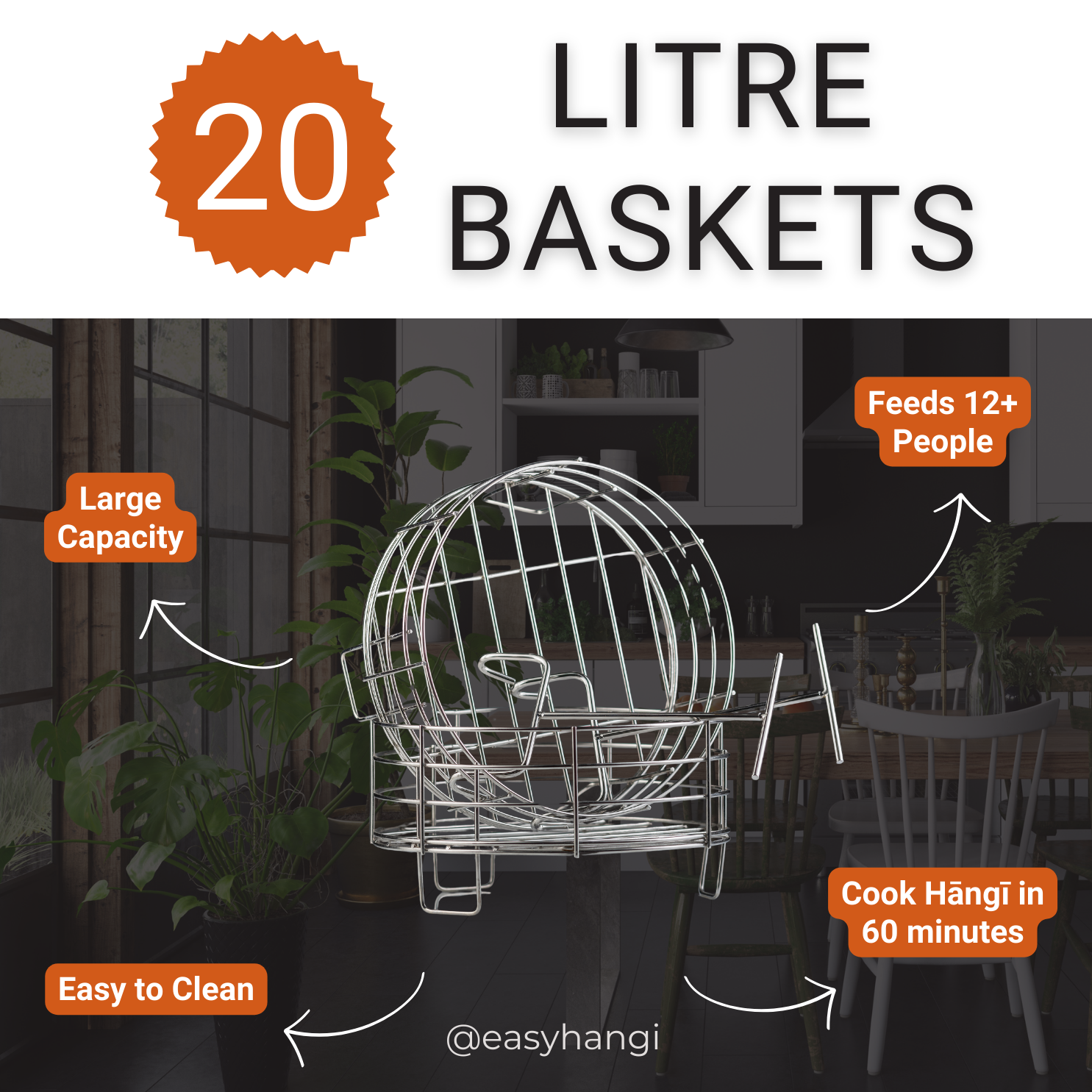 The 2 x 20 litre baskets should be used in a 20 litre pot able to handle the heat for Easy Hāngī cooing (15mins on stove full heat with no water in pot then add 1.5 litres hot from tap. And cook for 45mins more...).